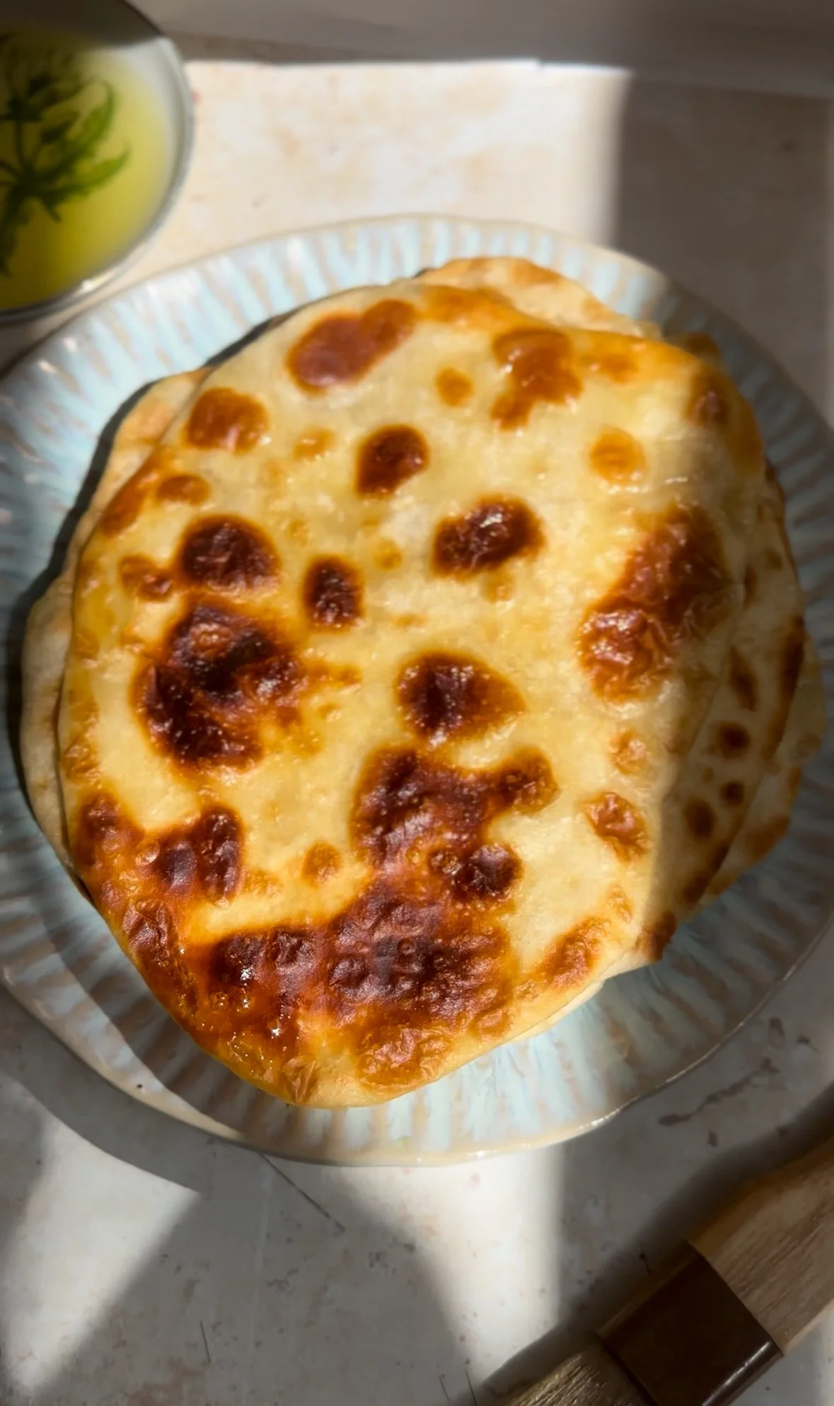 Transfer the flatbread to a plate and continue cooking the remaining prices. To keep them warm, cover with a clean kitchen towel or tin foil