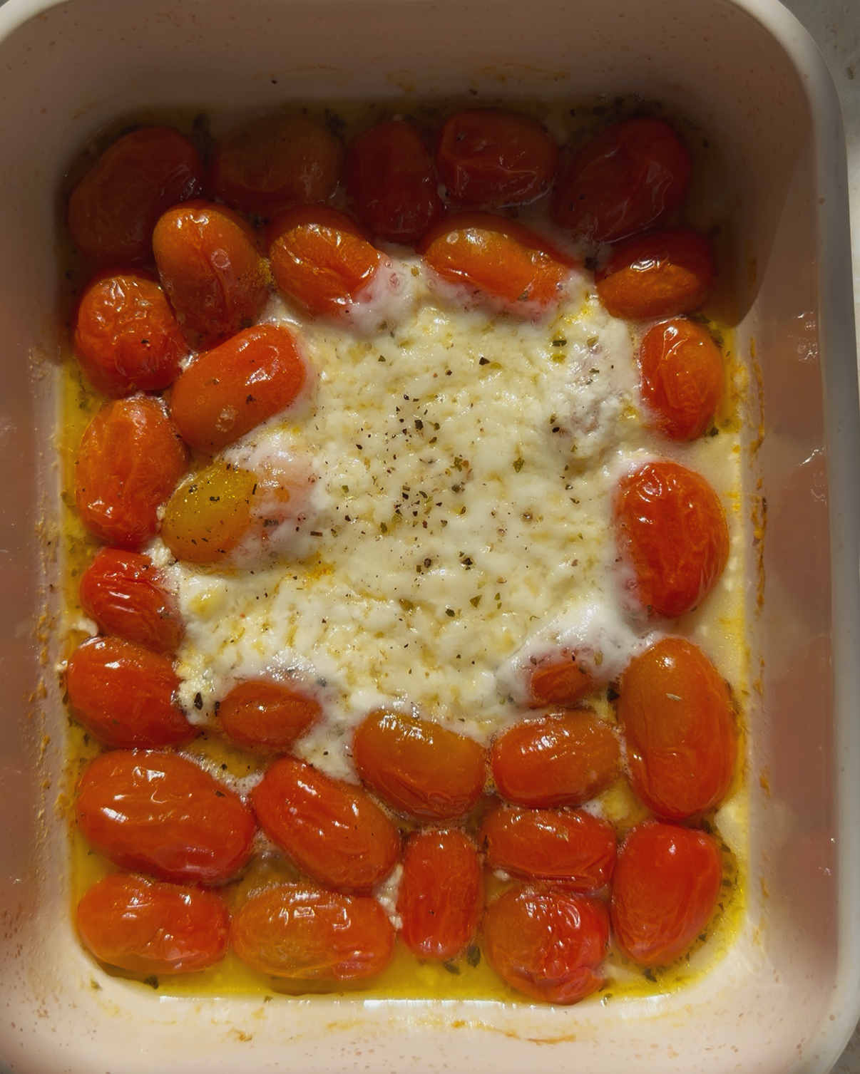 Add the burrata to the center of the baking dish and drizzle with the olive oil. Cover with tin foil and bake in the oven at 180C for 40min.