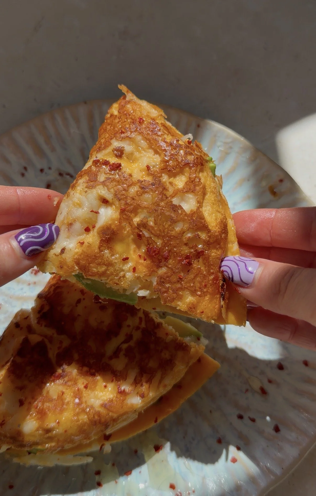 To one hald of the omelette add the shredded mozarella, and the sliced avocado. Season with the salt, chilli flakes. Using a spatula fold the omelette in hald and cook for 1-2 more min so the mozarella melts.